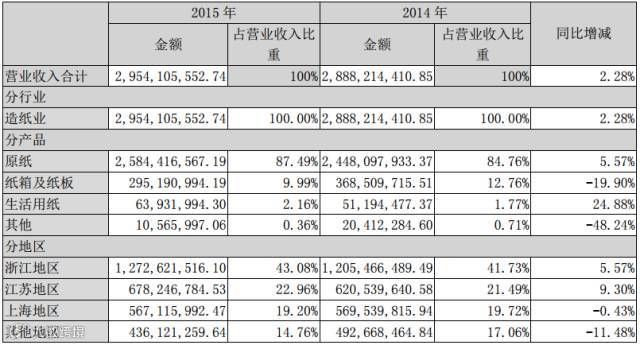1、营收构成情况:纸箱原纸业务2015年营收约25亿元,占总体营收比重达87.49%,纸箱及纸板业务营收约2.9亿元,占比9.99%。