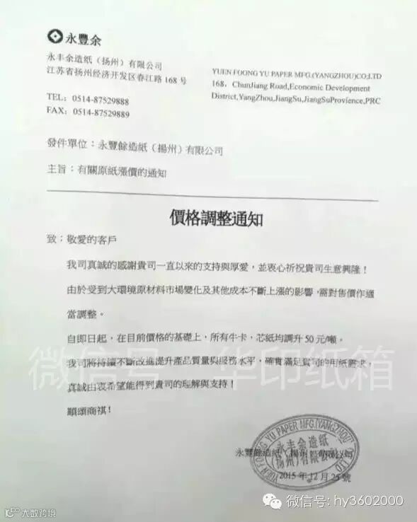 12月25日,江苏理文造纸发布涨价通知,宣布自12月25日将所有牛卡、芯纸和白面牛卡提涨50元/吨!几乎在同一时刻,小编还收到了2份涨价函,分别来自扬州永丰余和河南亨利纸业。