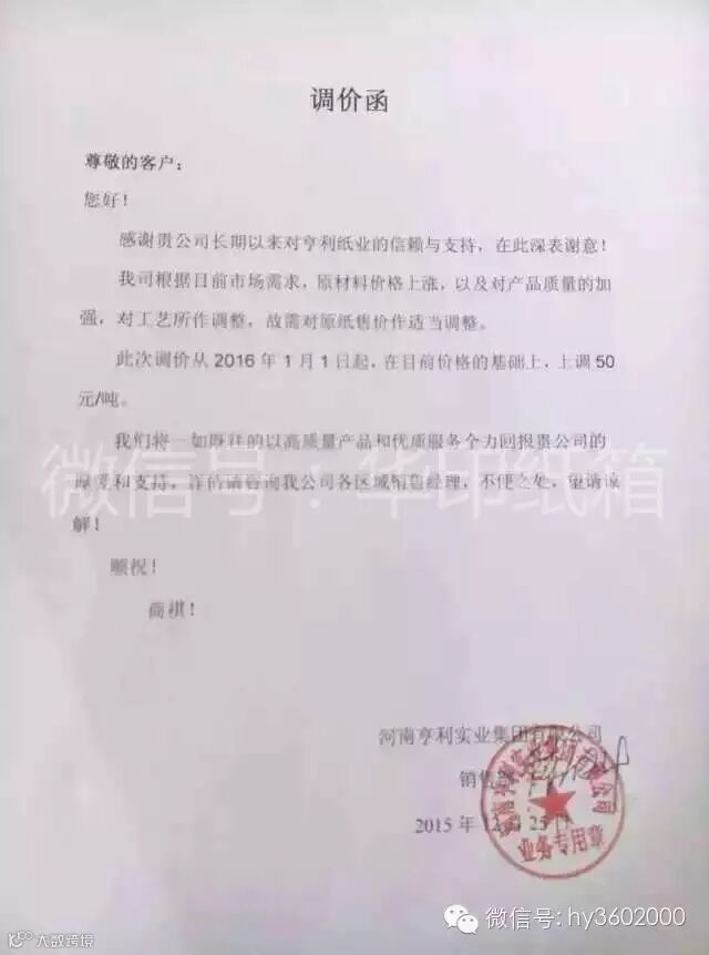 河南亨利纸业也宣布自2016年1月1日起,上调纸价50元/吨!据了解,河南亨利纸业年产成立于2002年,年产高强度瓦楞纸20万吨。