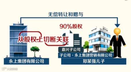 2014年11月,郑某强将集团公司持有的嘉兴子公司90%的股权,无偿转让到另一家子公司永上集团营销有限公司的名下,又把营销公司持有的所有股权和个人股份,通过无偿转让和赠与的方式,转让到自己儿子的名下,从股权上切断了嘉兴子公司和母公司的关联。