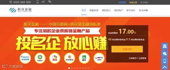 链接:新沃金融是新沃集团旗下创新型P2P网络借贷平台,平台专注发展“供应链金融”业务,已相继推出“大金保利项目”、“绝味食品项目”、“凯迪电力项目”、“源宝系列项目”等多款互联网金融产品。新沃金融的母公司新沃集团是以金融综合服务为核心的产业集团,累计资产管理规模超过200亿元人民币,业务涉及私募股权投资、公募基金等传统金融领域,也涵盖房地产、大健康、TMT、新能源等多个实业领域。