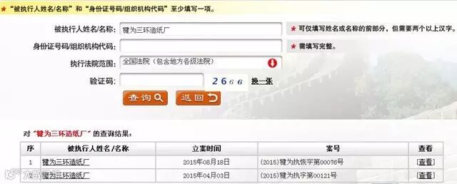 在最高人民法院网被执行人查询表中,搜索“犍为三环造纸厂”,小编发现该厂今年先后2次因欠债不还被列入失信被执行人名单。一次是在2015年4月3日,另一次是2015年8月18日。