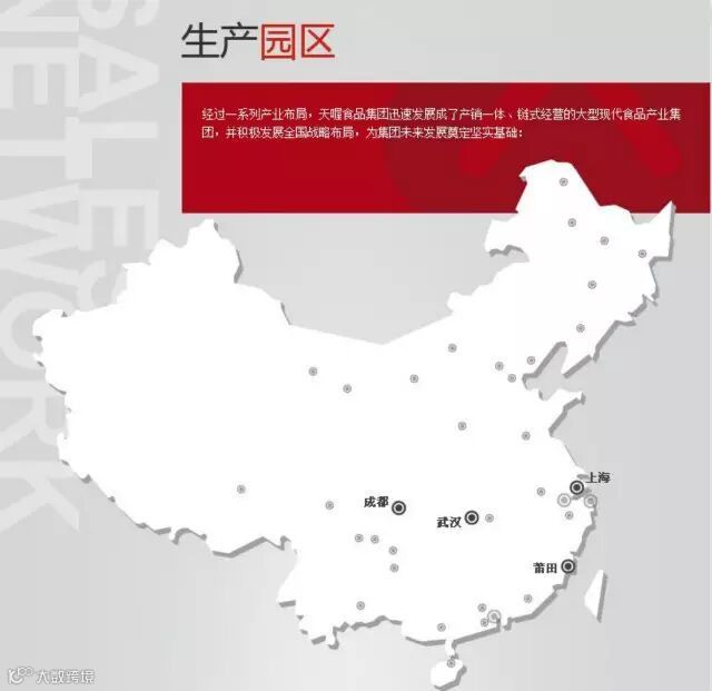 天喔食品(集团)有限公司先后在上海、福建、湖北、四川设立了大型生产园区,其中,上海园区位于上海市松江区,主要从事集团食品的生产加工;福建园区位于福建省莆田市,是生产蜜饯、炒货的大型基地;湖北园区位于湖北省武汉市,主要进行茶饮料、休闲鱼肉制品的生产加工;四川园区位于四川省成都市,是生产食品、茶饮料的大型基地。四大生产园区全面覆盖了华东、华南、华中、西南地区。2013年总产值已超100亿元人民币,合计约需8亿纸箱。