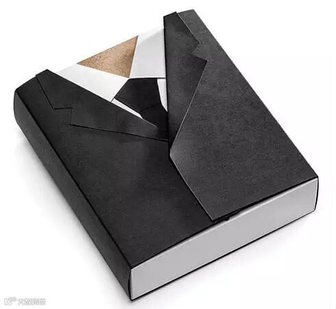 【正文】这个包装相当于是在普通的瓦楞纸盒子的外面再套了两层纸,一层看上去像是白色的衬衣,另外一层看上去则像是黑色的西装——到了拆包裹的时候,打开西装就会看到雪白的衬衣,而衬衣口袋里面,正装着名片~