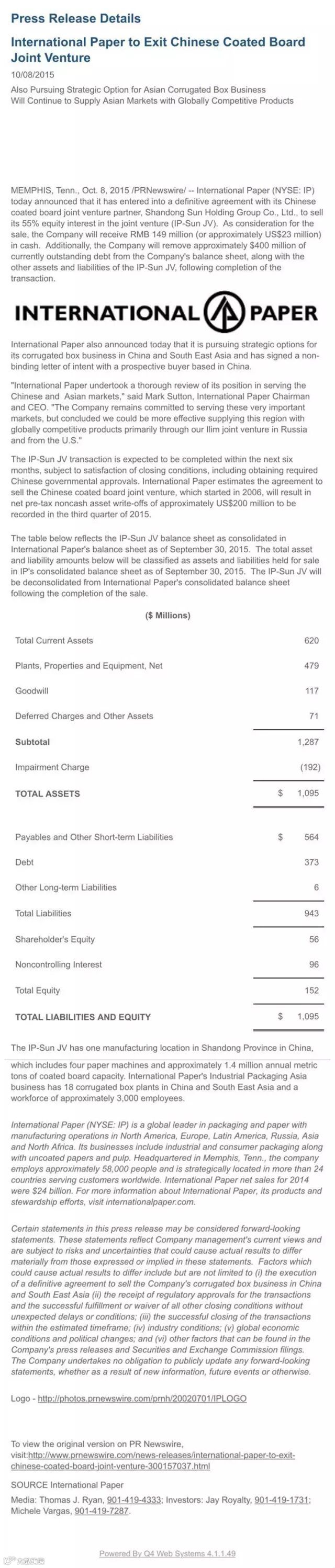 美国国际纸业10月8日公告指出,山东太阳控股集团有限公司已明确表示将购买国际纸业在万国太阳合资公司中占有的全部合计55%的股份。此次交易美国国际纸业将获得约1.49亿元(约2300万美元)的现金收入。与此同时,交易完成后美国国际纸业将从公司的资产负债表中将合资公司中当前未偿还的约4亿美元债务剥离。据悉,经过退出条件谈判及中国政府审批后该交易将在6个月内完成。