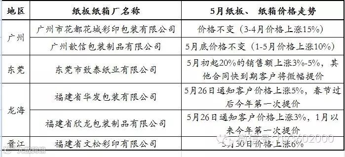 ——纸板、纸箱价格5月底、6月初提涨3%-6%