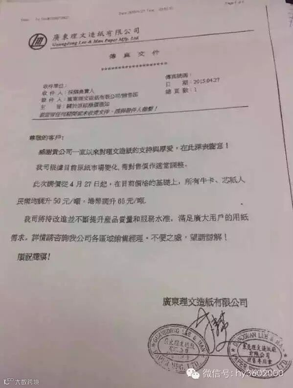 不少纸箱厂4月15日都收到玖龙纸业的一份文件——调价通知,该通知指出玖龙纸业将于4月15日起将各类牛卡纸价格上调50元/吨!至于涨价的原因,玖龙则依旧同3月提价一样,继续打温情牌,无奈地表示:“本次价格调整仅予缓解企业经营的现实困难,实属无奈之举”。