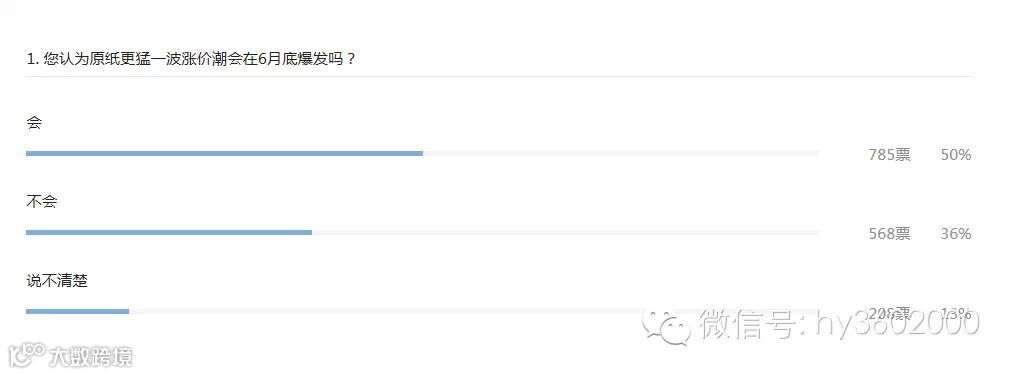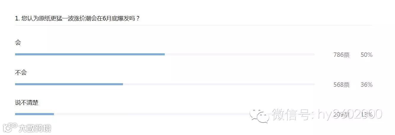针对此轮原纸上涨行情,我们做了多次后市预测投票,结果显示普遍看涨居多,且多数业内人士预测上涨将延续至6月甚至是8月以后。