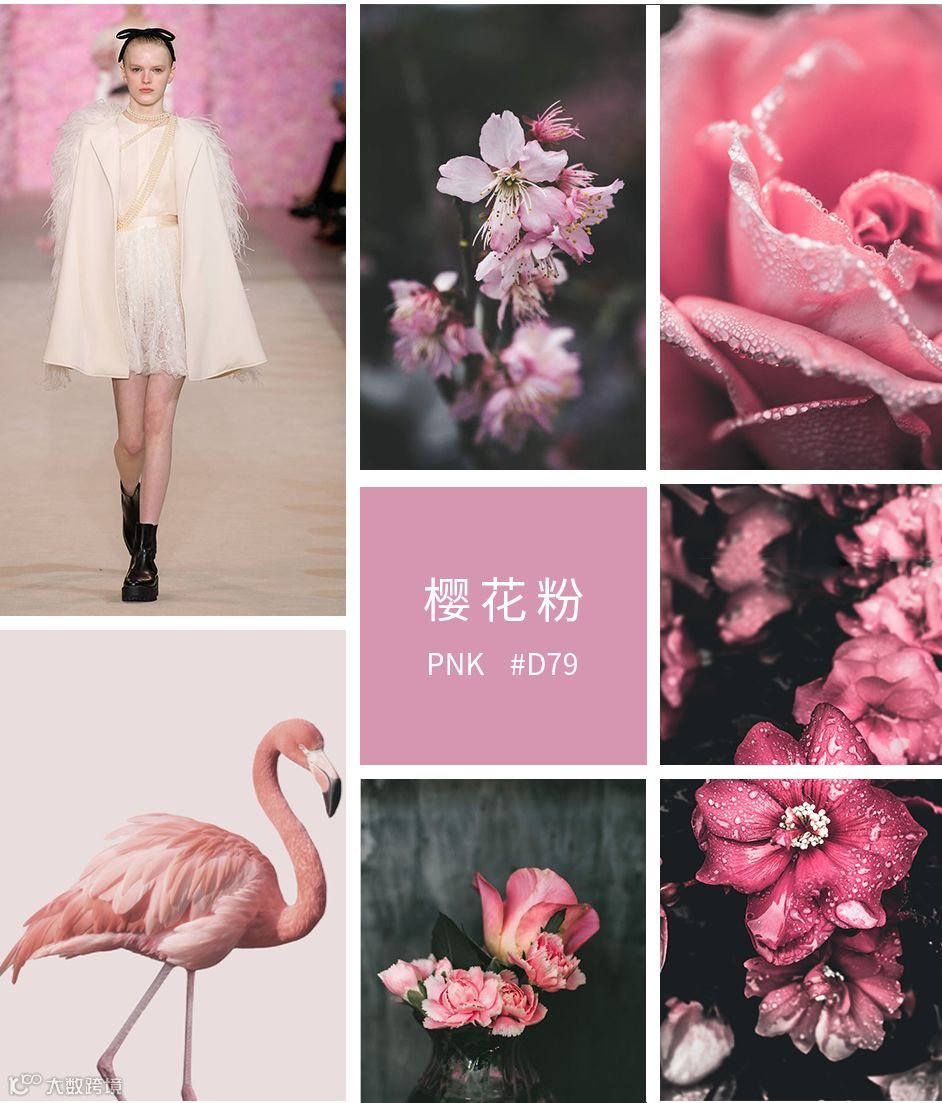 色彩解析:樱花粉+高级灰+青草绿+亮白色