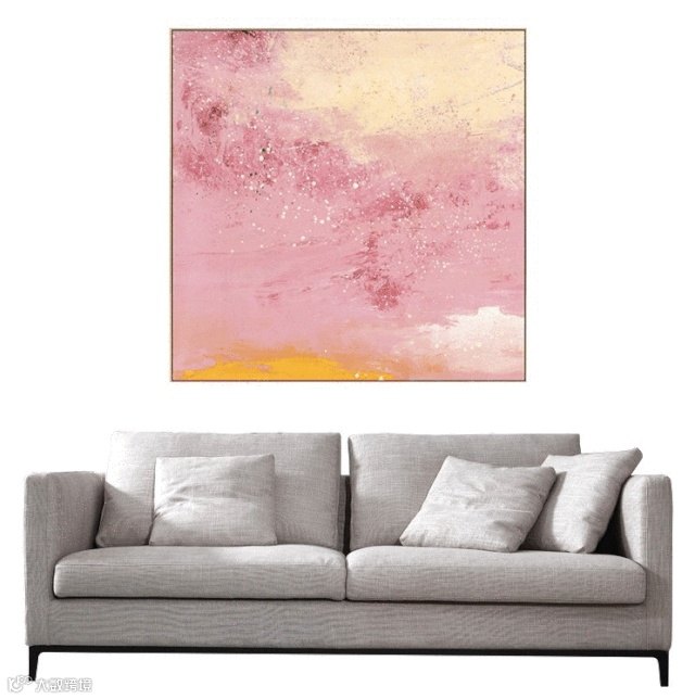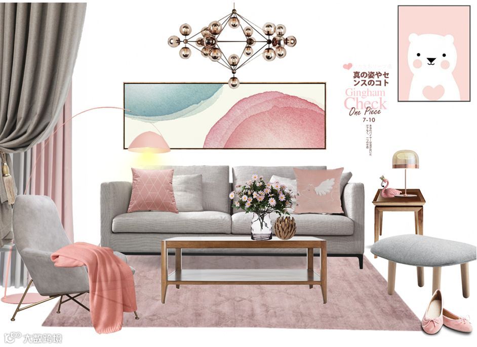 百搭款极简高级灰的沙发,浅粉色毛绒质感的抱枕,木质的角几上配以同色系摆件,窗帘使用的了小面积的粉色作为呼应,茶几上可摆放一些鲜花绿植增加空间的生机。挂画作为整个空间的亮点所在,