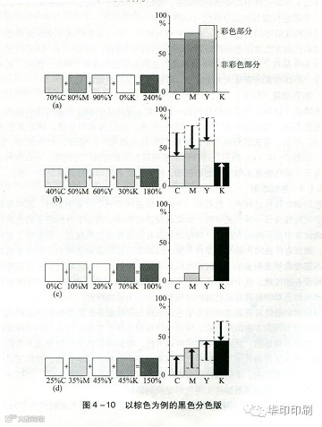 与彩色构成的不同,理论上,在非彩色构成中,所有非彩色成分全部由黑色代替,不再通过增加彩色的方法加深色彩的暗调,而是仅仅使用黑色。如图4-10(c)所示。图中的棕色色块由10%品红、20%黄和70%黑组成,总网点覆盖率仅有100%,因此,在全图和全色调中,青、品红和黄的墨量大大地减少,印刷过程变得更加稳定。