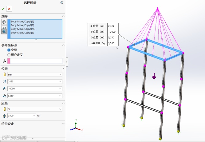 线性动力学中的另一个功能响应波谱分析经常被用于抗震分析,在SOLIDWORKS Simulation 2026中,响应波谱分析新增远程质量施加功能。用户可以通过用简单的远程质量设置替换复杂部件,简化抗震分析流程,在保证精度的同时,显著缩短设置与求解时间。远程质量在选定的面、边线或顶点处与模型的其余部分以刚性方式连接。