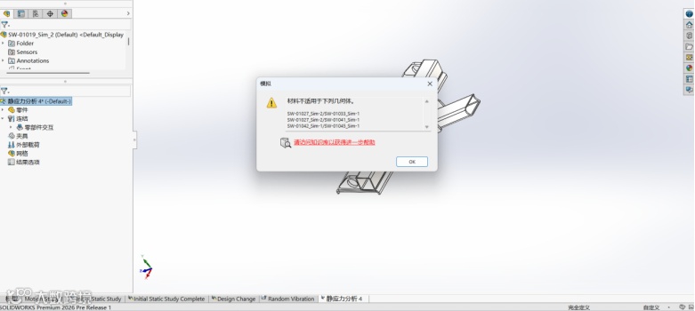 在进行装配体分析时,由于用户忘记为某些零件给定材料,或者某些零件网格划分失败而导致求解报错,这是经常会发生的情况。针对这一情况,SOLIDWORKS Simulation 2026中的求解报错提示会更加细致,能直接显示没有给定材料/网格划分失败的零件及名称,帮助用户快速查找并作出修改,提升仿真效率。