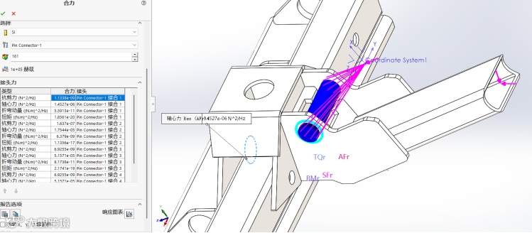 随机振动分析是SOLIDWORKS Simulation线性动力学中的功能。在2026版本中,如果用户在随机振动分析中定义了销钉接头,那么可以在求解结果中查看销钉接头力。Simulation会根据销钉连接的接合面对应输出接头力,如轴力、剪力、弯矩和扭矩,用户可以很方便的查看随机振动作用下销钉的接头力大小,也可以输出对应的响应曲线。