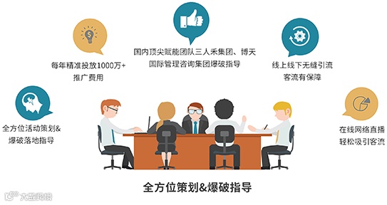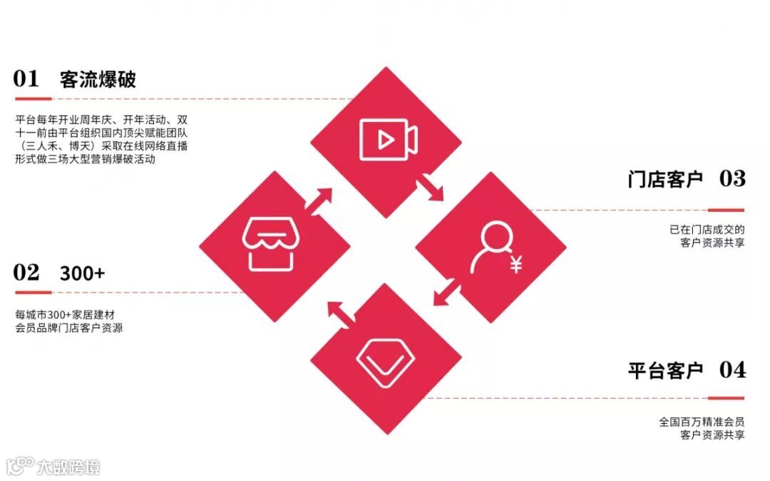 国内顶尖赋能团队(三人禾、博天)采取在线网络直播形式做三场大型营销爆破活动;每城市300+家居建材会员品牌门店客户资源;已在门店成交的客户资源共享;全国百万精准会员客户资源共享。