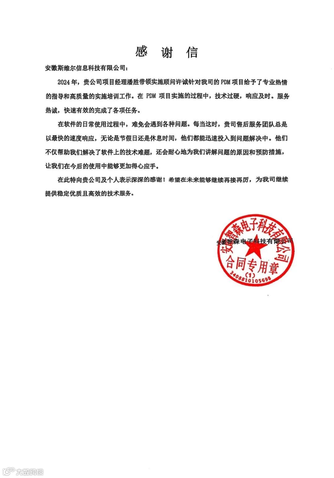 近日,斯维尔科技收到服务客户安徽智森电子科技有限公司的感谢信。这封信不仅是对斯维尔团队辛勤付出的肯定,更是对其专业技术实力和服务质量的高度认可。