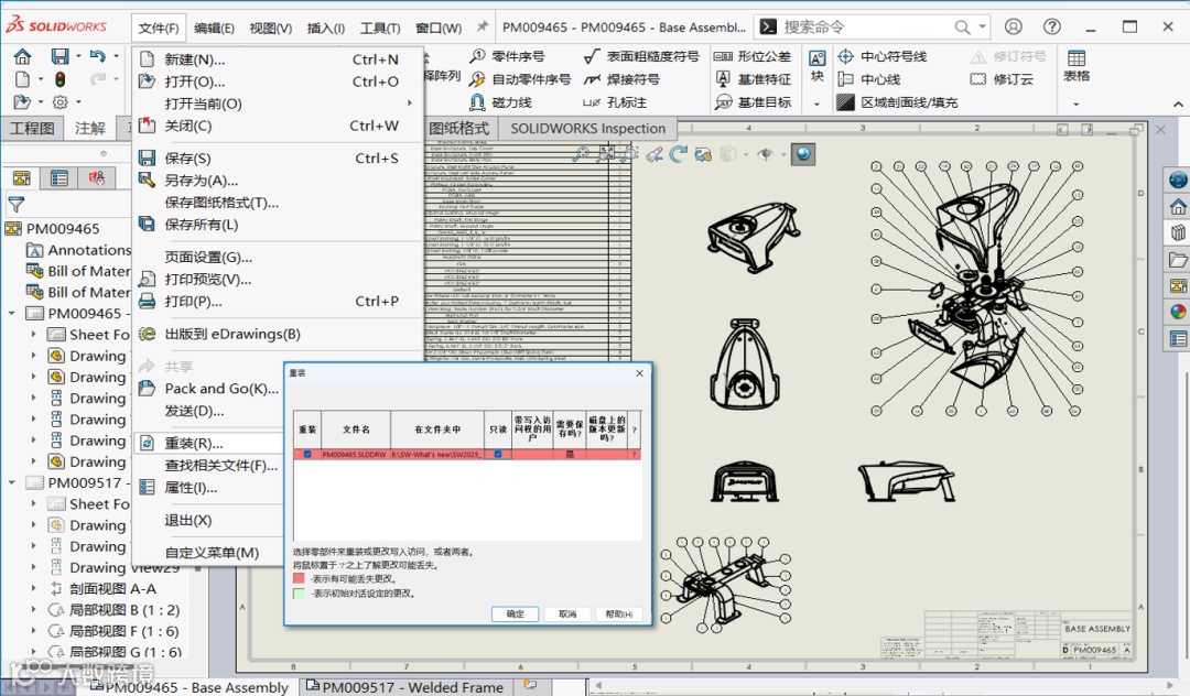 SOLIDWORKS 2025 现在具备重新加载图纸的功能。用户只需单击 “重装”,就可以恢复为上一次磁盘最后保存的版本,无需重新打开工程图。同时,若存在潜在的更改丢失情况,还会有对话框进行提示,这一功能极大地提高了工作效率,节省了时间。