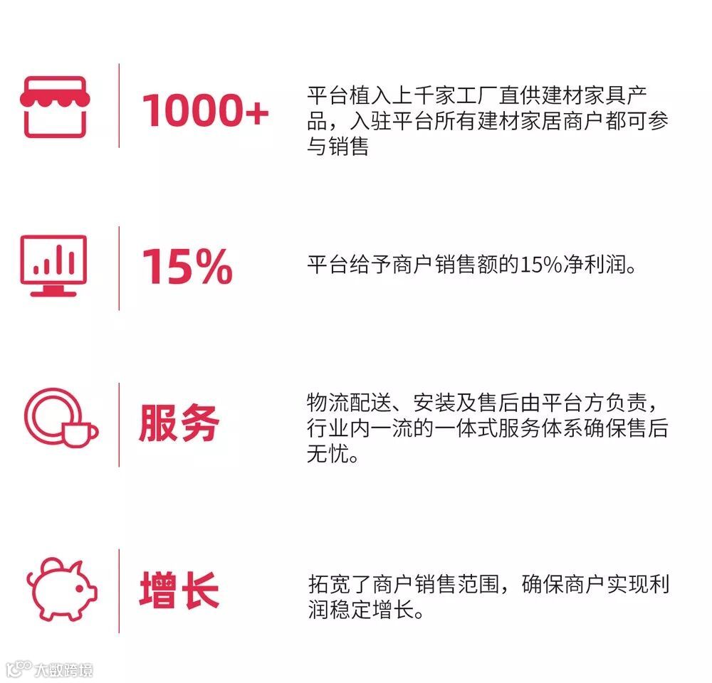 平台植入上千家工厂直供建材家具产品,入驻平台所有建材家居商户都可参与分润模式销售,平台给予商户销售额的15%净利润,物流配送、安装及售后由平台方负责,拓宽了“会员商户”的销售范围,实现利润增长。