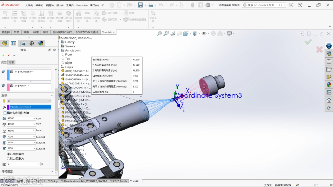 在SOLIDWORKS Simulation 2025新版本的连接设置中,增加了新的“常规弹簧接头”命令,在“常规弹簧接头”中,用户通过选择弹簧两个接触面及自定义坐标系,确定弹簧的连接方式及连接方向。与旧版本的“弹簧”接头相比,新的“常规弹簧接头”可以允许用户更加灵活的定义弹簧刚度,如纵向刚度、各向异性的横向刚度、扭转刚度以及折弯刚度。