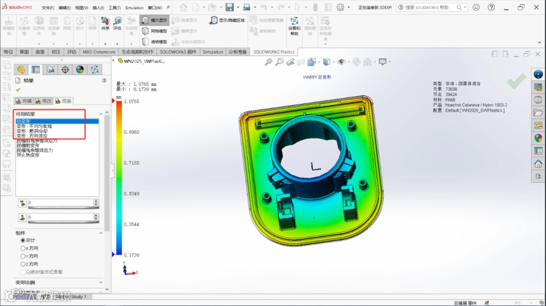 SOLIDWORKS Plastics 2025中增强了“翘曲”功能。在注塑成型中,零件产生的翘曲主要是由于冷却不均匀、收缩不均及分子取向不一致。新版本中除了翘曲总变形外,用户也可以单独查看由于冷却不均匀、收缩不均及方向效应所导致的翘曲变形,分析导致翘曲最主要的原因,帮助模具设计工程师更好的提高产品性能。