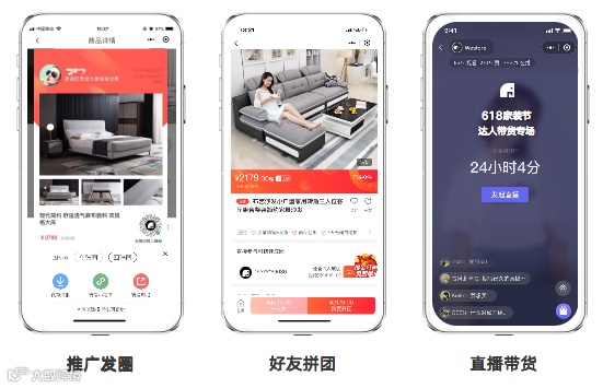 大象居家本着“促进平台、商户、员工和消费者实现多方共赢”的理念,充分通过微信、朋友圈、小程序、公众号、服务号生态内的完美衔接,最大程度地导入流量,借力推广媒体、社交关系传递等多重组合方式的布局下,可以实现覆盖60多种引流入口;同时我们开启了【工厂直供+百城千店】计划,对传统流量进行精细化挖掘,通过分润模式销售集团供应链产品,吸纳各个触点的流量引流到平台,持续为平台流量加码。
