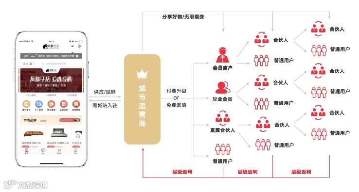 与此同时,大象居家在社交裂变中叠加了层级裂变。平台拥有品牌方、工厂、同城千店融合成的供应链产品池,集成开放给用户,通过分佣机制激励会员商户、合伙人等专属角色完成层级裂变,从用户拉新到留存全生命周期进行更高效的低成本运营,实现全流程降本增效,解决会员商户高额成本问题。