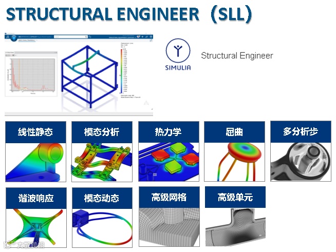 Structural Engineer(SLL)结构工程师,是3DEXPERIENCE平台上的一个结构仿真角色,其在SRD的基础上增加了谐波响应和模态动态分析。同时SLL也支持高级网格和高级单元,多分析步功能也可以在SLL中使用,帮助工程师更好的模拟真实工况。SLL支持以下类型的模拟: