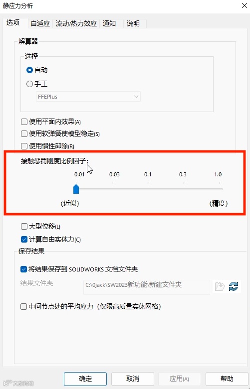 SOLIDWORKS Simulation 2023新增了“接触的惩罚刚度控制”功能,可以帮助我们实现静态分析时间及精度的控制。