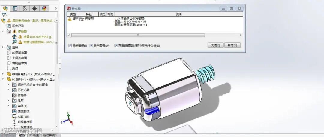 SOLIDWORKS传感器用于监视零件和装配体的所选属性,并在数值超出指定阈值时发出警告。