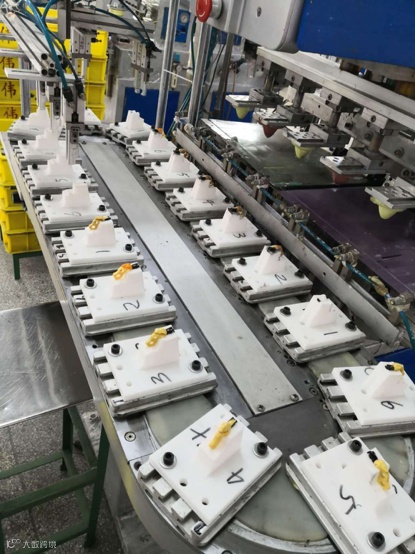 图4中产线上白色底座的部分是利用3D打印技术制作的夹具,用于移印生产线上对产品固定。