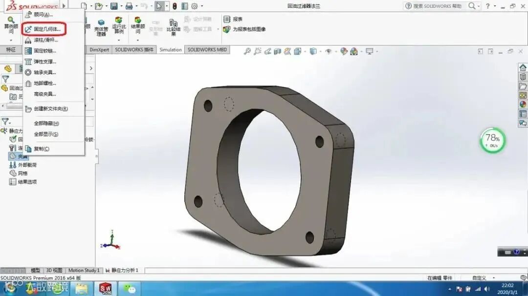 在Simulation Study树中,右键单击【夹具】,选择【固定几何体】,或是在【夹具顾问】下单击【固定几何体】。