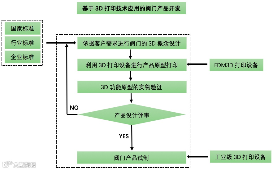 根据3D打印在阀门行业中的应用总结, 3D打印支撑阀门产业发展的应用流程图如下: