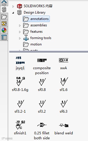 SOLIDWORKS工程图中常用的注解符号,例如表面粗糙度符号、形位公差、焊接符号、技术要求、图块等都可以放置到注解库中。
