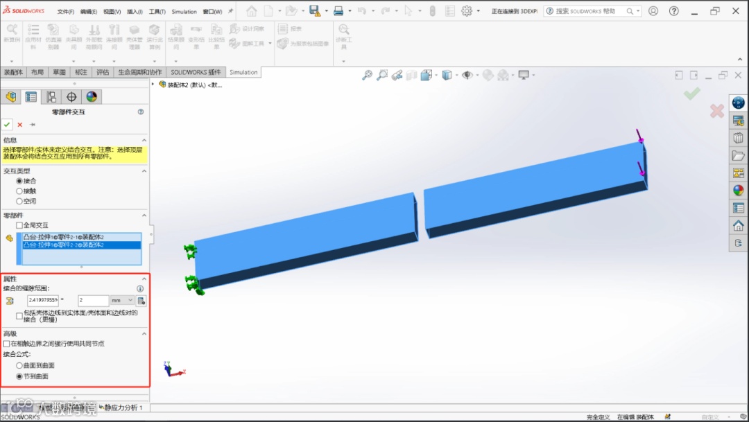 关注SOLIDWORKS Simulation最近几个版本的新功能的工程师应该都用过接触面组设置中的“缝隙范围”功能吧,我们可以通过定义缝隙范围让软件自动将有间隙的两个面定义成接合接触。但是在旧版本中,如果选择的是“节点到曲面”的接合公式,有时会出现无法正确识别有间隙相触面组的情况,这会引起接触面识别错误从而导致分析出错。这点在新版本中有明显改善,在选择“节点到曲面”的接合公式后,软件能正确识别缝隙范围并添加对应接触,对仿真效率和准确率的提升有很大帮助。