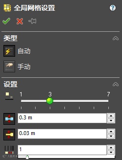 设置全局网格精度为3,最小缝隙尺寸0.3m,最小壁面厚度0.03m;如下图:(如果最小壁面厚度选项不可用,请在Flow选项对话框常规选项下面的显示/隐藏壁面厚度选项选择显示)