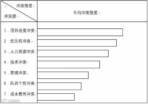在项目进程中,项目进度冲突强度最大,项目优先权冲突排在第二位,人力资源是第三位冲突源,强度排在第四位的冲突源是技术冲突,管理冲突程序上的冲突列第五位,项目成员的个性冲突通常被认为是较低强度的冲突。而作为一种冲突源,费用排在最低。