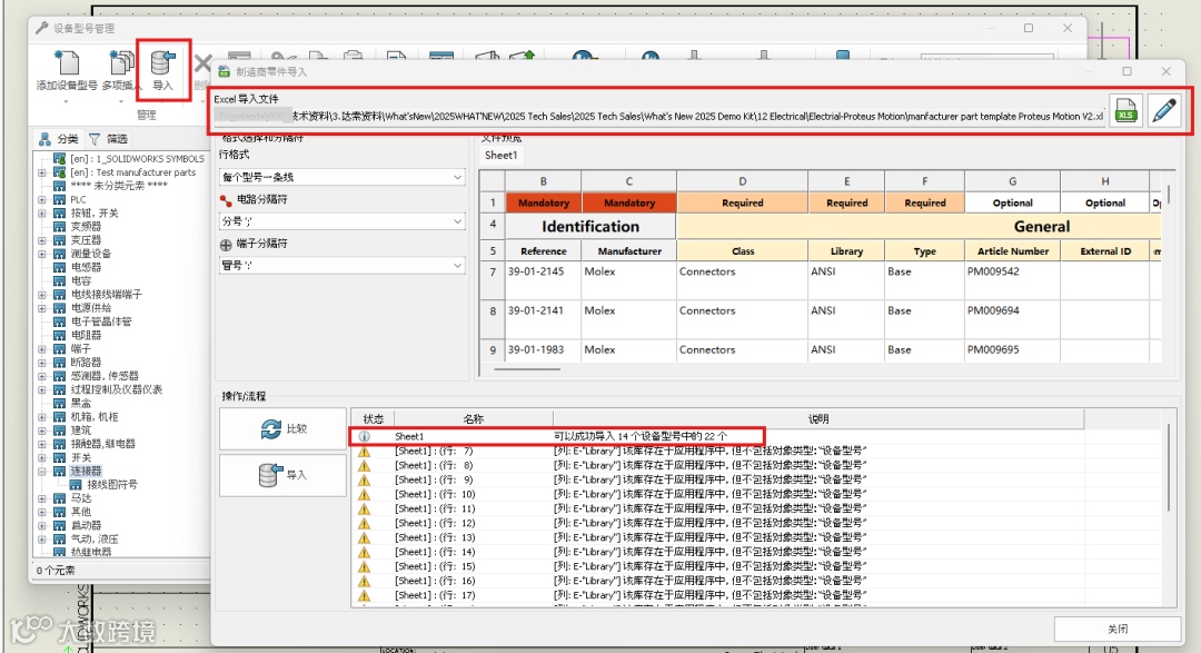 Excel 导入电缆和制造零部件:使用Excel将电缆参考和制造商零件导入库,并提供完整的详细信息,该功能支持其他电气软件或系统通过Excel格式将电气零件库批量导入SOLIDWORKS Electrical 2025中,大大节省了标准化建库的工作,提升了部件库的数据传递的便利性。