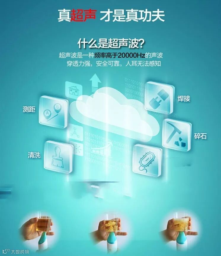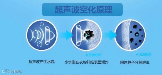 超声波能够令液体产生巨量的超微小气泡,而这些小气泡破裂时形成的微激波就犹如炸弹爆炸时引起的冲击波。这些接连的冲击波就会把衣物纤维上的污渍分解并将之脱离,从而达到了强效的去污效果。