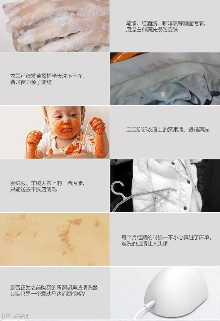 当碰到令你头疼的污渍时,不用着急,也不用整件一起洗。只需一点清水滴到污渍处,在洗衣笔强劲的超声波高频震动冲击下,在超声波空化原理的作用下,新鲜污渍只需30秒就能清除。