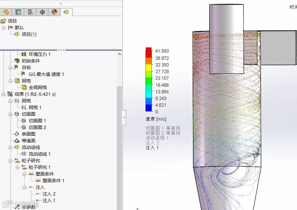 接下来让我们用流体模拟研究,气流从入口进入后的流动状态,流速、静压分布等。由于旋风分离器真实流体是有少量的固体颗粒,我们可以在单项流体的基础上注入固体粒子,可以直观的看到固体粒子在流场中的运动轨迹。直观的了解其原理,并为设计优化提供参考。