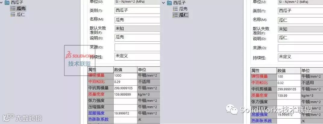 2、根据统计结果,选用合适的大小建立模型,瓜壳和瓜仁单分开。瓜壳的材料参数近似为木材,瓜仁的弹性模型比果壳小的多。材料参数如下: