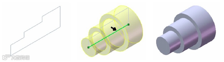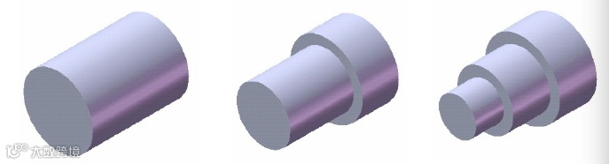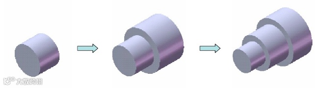 加工法是模拟机械加工过程的方法来建立零件模型,如本例,按照加工方法来说是“下料——车外圆1——车外圆2”,对应于特征可以认为是“拉伸凸台——旋转切除1——旋转切除2”,这是建立轴类零件最好的方法,体现了零件加工和零件建模的统一。