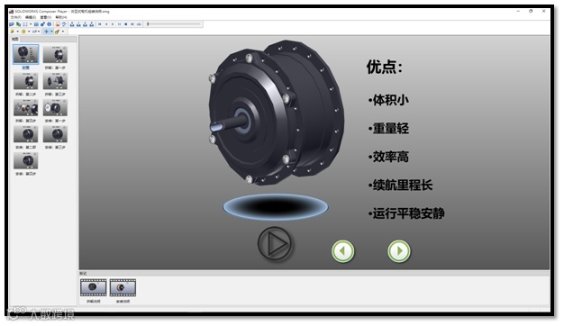 示例文件中,已经包含了电机详细的拆卸及组装动画,包括箭头指示、文字说明以及特写镜头等等,相较于传统的纸质作业指导书,动画的形式更加便于理解和学习。