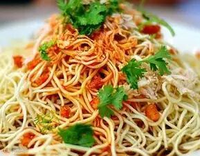 44. 开洋葱油拌面——以熬香的葱油加上烧透的开洋,和面条一起拌着来吃。地道的开洋葱油拌面,面条有韧劲又滑爽,开洋鲜美,葱油则是喷喷香。一碗好味道的拌面在手,桌子上即使有再多的小菜,保证你看也不会看一眼。