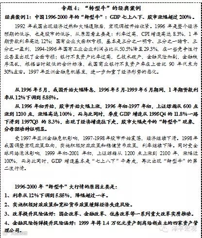 以房地产长周期拐点到来为标志,中国经济步入增速换挡期下半场。未来中国经济和资本市场的阶段性特征,类似日本1975-1980年、中国台湾1986-1990年、韩国1999-2006年在增速换挡期下半场的表现(详阅《增速换挡期的牛市催化剂:国际经验与中国未来》)。如果跟自身比,类似中国在1996-2000年的表现。都属于典型的“转型牛”而非“周期牛”,主要是分母驱动的,而不是分子驱动的。周期牛”的演进规律是政策底→市场底→经济底,“转型牛”的演进规律是改革底、无风险利率顶→市场底→经济底。无风险利率下降提供了牛市催化剂,改革提升了风险偏好(参见专题4:“转型牛”的经典案例)。