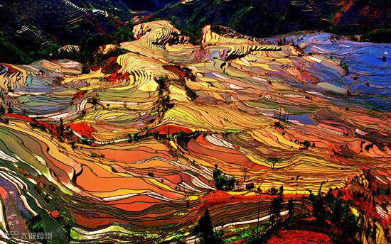 阳梯田位于云南省元阳县的哀牢山南部,是哈尼族人世世代代留下的杰作。元阳哈尼族开垦的梯田随山势地形变化,因地制宜,坡缓地大则开垦大田,坡陡地小则开垦小田,甚至沟边坎下石隙也开田,因而梯田大者有数亩,小者仅有簸箕大,往往一坡就有成千上万亩。元阳梯田规模宏大,气势磅礴,绵延整个红河南岸,是红河哈尼梯田的核心区。2013年6月22日哈尼梯田被成功列入世界遗产名录,成为我国第45处世界遗产。
