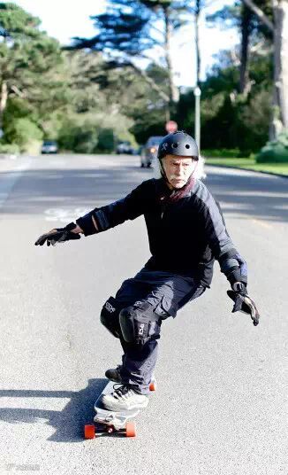 78岁的滑板手Lloyd Khan,在65岁时才第一次踩上滑板,立马就摔了下来,弄伤了手。即便如此,他内心知道自己找到了爱好所在,从那时开始练习滑板一直到今天,不过他的防护装备很齐全。他说:“我不会玩什么花样,不像那些十几岁的人的滑得那么快。”