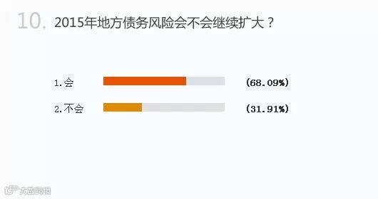 对地方债务风险的担忧,在本调查的另一个问题“目前中国经济最大的问题是什么?”中也有显现。人们对地方债风险爆发的担忧显然更上了一步,68%的学者认为2015年地方债务风险会继续扩大。那么,怎么防风险控风险就成了尤为关键的问题。应该说,地方财政收入增收项不多,消除债务的手段有限,这种情况下,只要地方政府行为和考核机制未改,地方债的问题就值得重点关注。