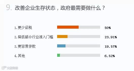 9、 您认为改善企业生存状态,政府最需要做些什么?—— 从企业那少拿点,再少拿点!