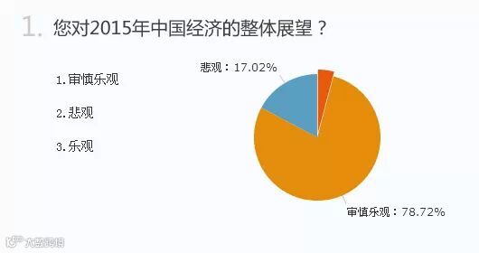相比2014年,2015年中国经济整体持审慎乐观态度的学者由67%上升到了78.72%,同时,持乐观态度的学者下降到了4.26%,因此整体上,仍然有83%的学者对中国经济保持乐观态度,当然我们也不能忽视,持悲观态度的学者由去年的4%大幅攀升到了17%。正如国防大学经济研究中心主任、教授卢周来所说:国际经济环境不乐观,内生经济增长新动力尚未形成。但偏宽松的货币政策与财政政策有刺激作用,改革所积蓄的势能将释放。